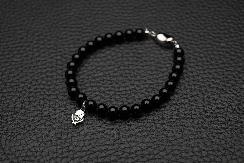 オニキスをメインで使用したストーンブレスレットです。シルバー925製のモダンパイレーツ・スカルをチャームをセンターにデザインしました。留め具はシンプルながら流れるような曲線が美しいビーンズ型のクラスプです。着ける時は差し込むだけ、外す時も押すだけなので着脱がとてもスムーズです。細めのデザインなので重ね着けや女性の方にもお薦めです。